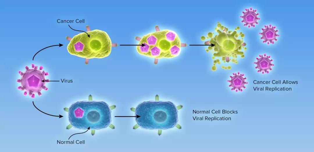 检查点抑制剂靶向一种特定的蛋白质,然而,抗癌病毒能唤起一种广泛的免疫反应,并且采用很多不同的方式靶向肿瘤细胞,这给抗癌病毒提供了广阔的临床应用前景。