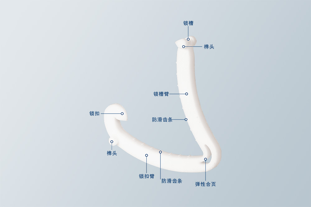 ● 弹性合页和V型锁孔锁槽设计,手感明确,快速有效结扎血管/组织
